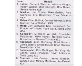 On the way to the Washington State Meet our team crushed the 4x100 records for the West Central Districts and our North Puget Sound League Championship. We lowered the John F Kennedy school record from 43.5 from the late 70s to 42 flat. We had one thing left to prove.